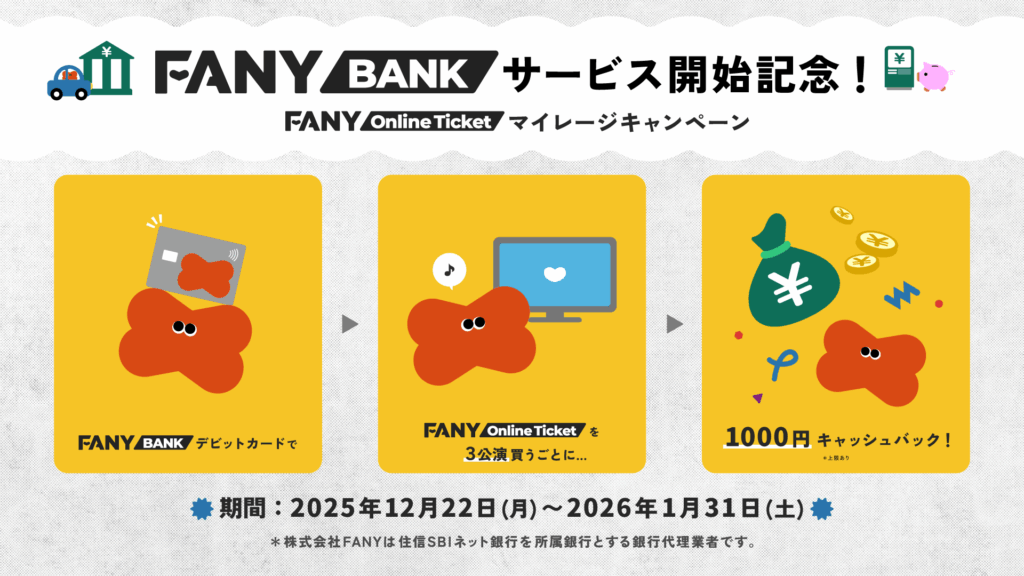 FANY BANKデビットでFANY Online Ticketを3公演買うと1,000円キャッシュバック 期間 2025年12月22日(月) - 2026年1月31日(土) 条件 FANY Online Ticketで … 続きを読む FANY BANKサービス開始記念!FANY Online Ticketマイレージキャンペーン!
